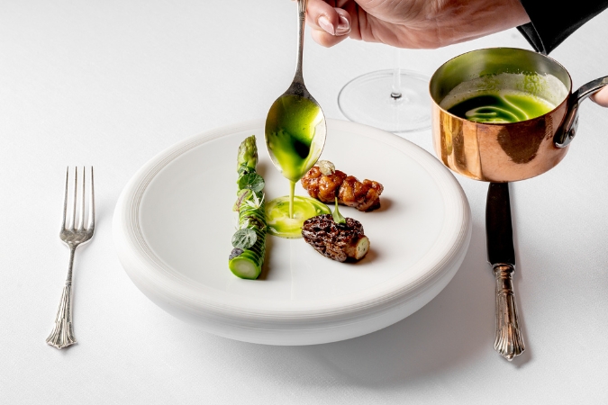 Grantley Hall may well be as close as a hotel gets to a mythical six-star rating, given the quality of the facilities and service on offer. While some guests may arrive by helicopter or in supercars, there is substance here beyond the ostentation, not least at Shaun Rankin’s Michelin-starred restaurant, where the ‘Taste of Home’ menu is inspired by his Yorkshire upbringing. The scroll placed on tables ahead of dinner indicates which ingredients across the 13-course tasting menu come from the kitchen garden or were foraged locally. Expect dishes such as asparagus, lamb sweetbread, morel and wild garlic (pictured); lobster, carrot, sea buckthorn and fennel; and wagyu beef rib with tartare, tongue, lovage and peppercorn. The ‘prestige’ wine flight impresses (as does use of the full Zalto range to serve it), and the dining room is sumptuous and palatial. Naturally, a visit here constitutes a blowout rather than budget weekend but the food is excellent and the luxury unrivalled. WM